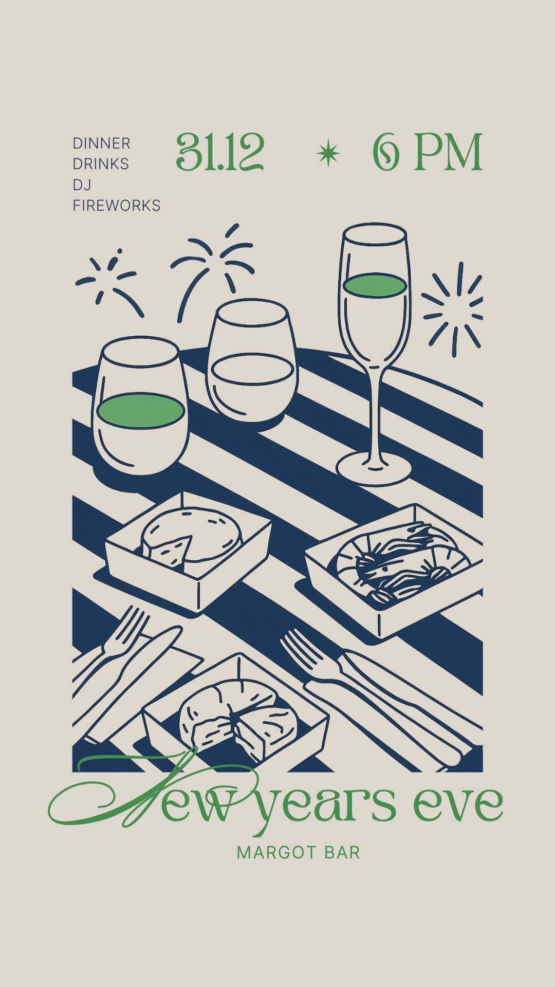 As a small bar with a compact kitchen, the NYE menu will roll out gradually from 6:30pm onward. To enjoy everything, please make sure you arrive between 6:30 - 7:00.